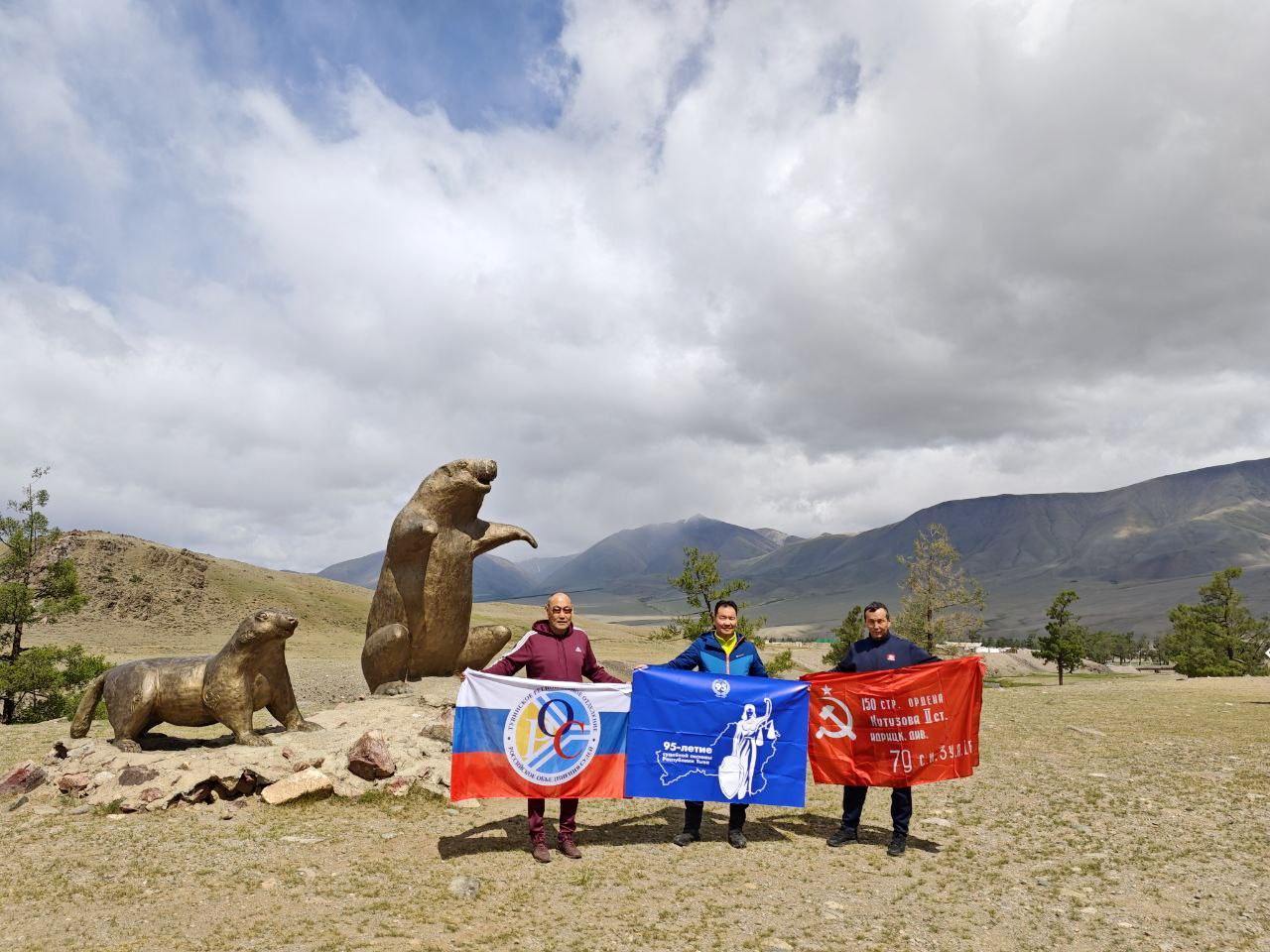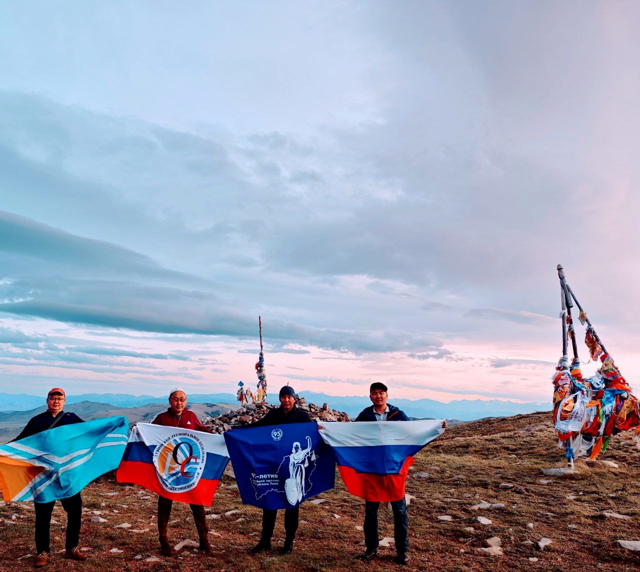 Восхождение наших коллег было посвящено важным юбилейным датам: 95-летию судебной системы Республики Тыва, 80-летию Победы в Великой Отечественной войне и празднованию Дня России. Так на вершину были подняты флаги Российской Федерации, Республики Тыва, Знамя Победы, Флаг «Российского объединения судей» и логотип 95-летия судебной системы Тувы.